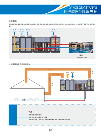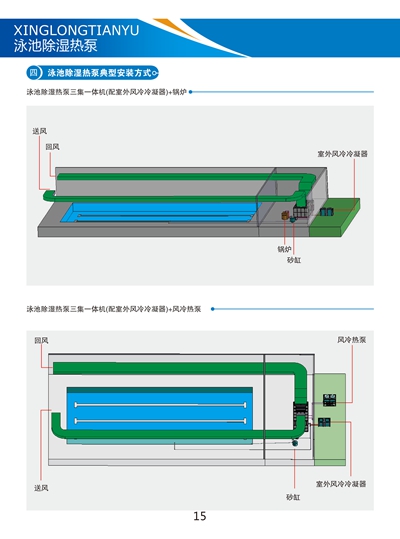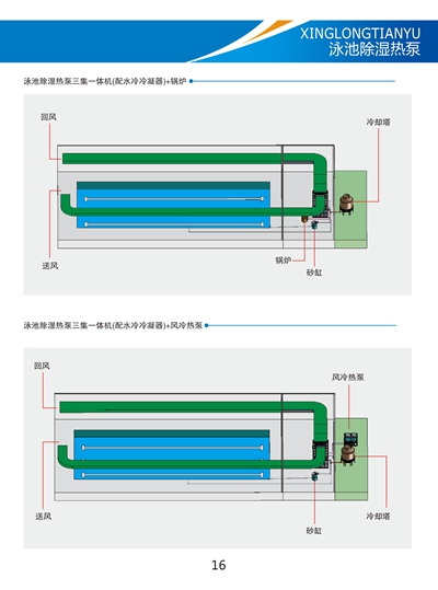 2、室內(nèi)恒溫泳池空間的暖濕空氣經(jīng)由回風(fēng)管道引至設(shè)備的回風(fēng)口,流經(jīng)設(shè)備蒸發(fā)器,使暖通空氣溫度下降,空氣中的水汽降溫凝結(jié)成水滴從空氣中分離出來,實現(xiàn)空氣除濕功能。在暖濕空氣降溫、水汽凝結(jié)(相變)的過程中釋放出的顯熱和潛熱被制冷劑吸收。制冷劑吸收的熱量經(jīng)池水冷凝器加熱池水,實現(xiàn)池水加熱功能;經(jīng)空氣再熱冷凝器加熱冷卻的空氣,實現(xiàn)空氣再熱功能;經(jīng)室外風(fēng)冷冷凝器或水冷冷凝器將熱量出,實現(xiàn)空調(diào)制冷功能。