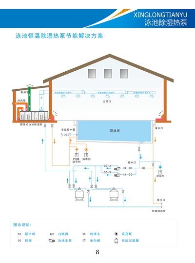 1、游泳館的設(shè)計是一項復(fù)雜的工作,需要認(rèn)真考慮能耗、舒適度、健康和安全等方面的問題。泳池里的熱、濕和化學(xué)物質(zhì)結(jié)合在一起,形成了對建筑和設(shè)備不利的惡劣環(huán)境。游泳館設(shè)計有很多重要的考慮因素,相對濕度水平、冷凝、空氣溫度、池水溫、空氣分布、室外空氣、排氣空氣、池水處理和氯胺控制都是必須要考慮到,泳池恒溫除濕系統(tǒng)設(shè)計的目的是綜合考慮好以上設(shè)計因素,提供一個安全、健康和舒適的泳池環(huán)境,同時將運營成本降到最低,并提供盡可能好的空氣質(zhì)量。