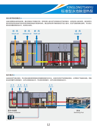 冬季當(dāng)除濕熱泵所產(chǎn)生的熱量不足以滿足要求時,外接熱源通至機(jī)組自帶的冷熱兩用盤管內(nèi)輔助制熱。夏季也可向冷熱兩用盤管通7/12℃冷凍水輔助制冷。設(shè)備帶新風(fēng)、排風(fēng)接口,通過新風(fēng)、排風(fēng)管道接入室外,通過排風(fēng)管道排出室內(nèi)部分渾濁空氣,通過新風(fēng)管道引進(jìn)室外新鮮空氣,保證室內(nèi)空氣品質(zhì)。